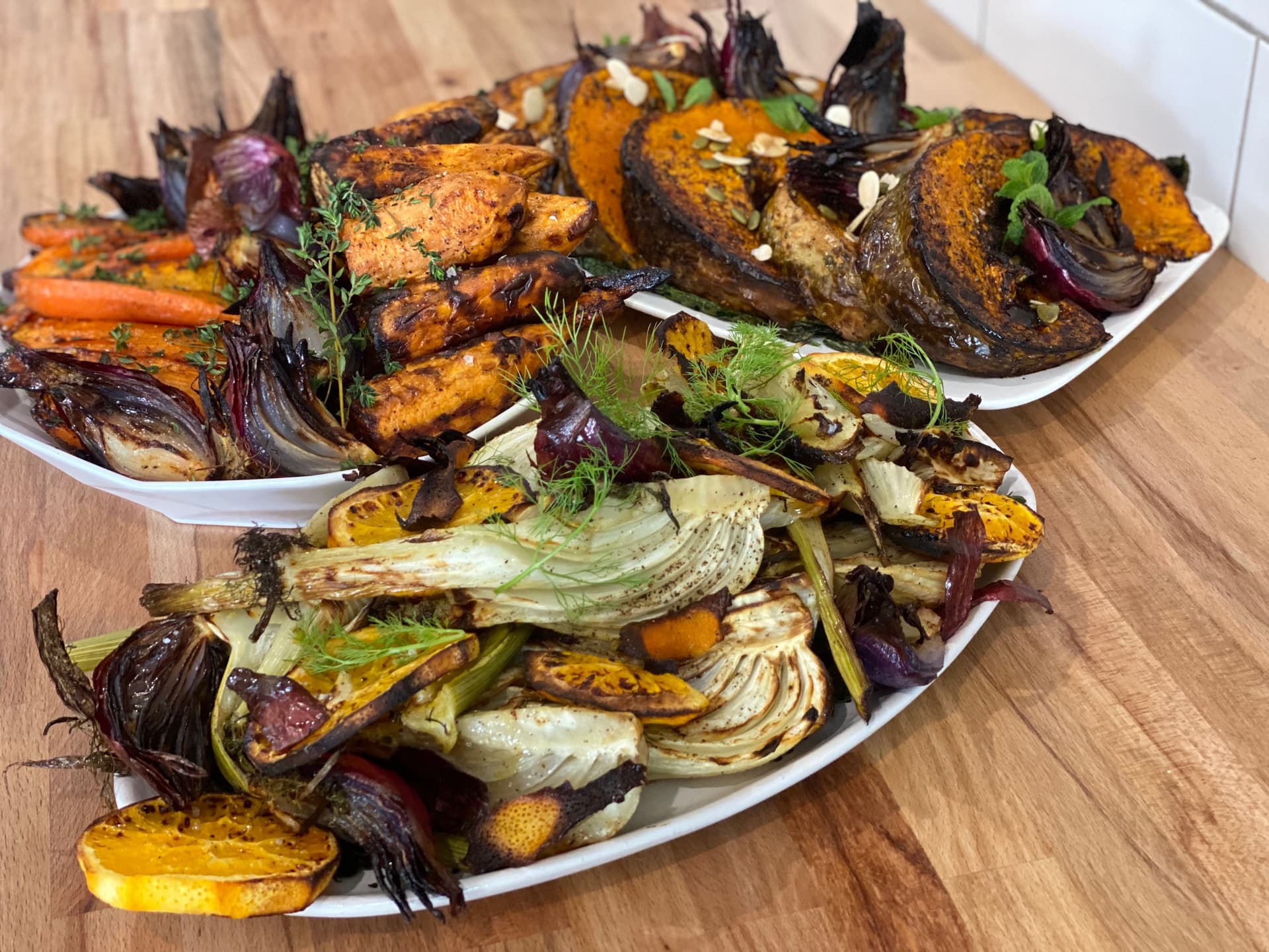 roasted pieces of pumpkin fennel red onion sweet potato and beetroot just re heat and serve vegetables may change seasonally