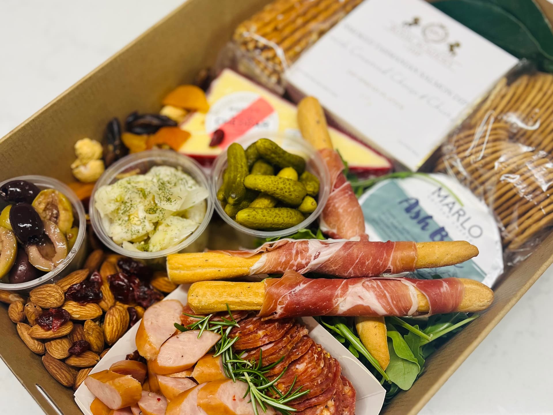 cold cut meats olives pickled vegetables 2 cheeses water crackers dried fruit and nuts and a dip-can be customised for dietary requirements serves 6-8 as an appetiser.
