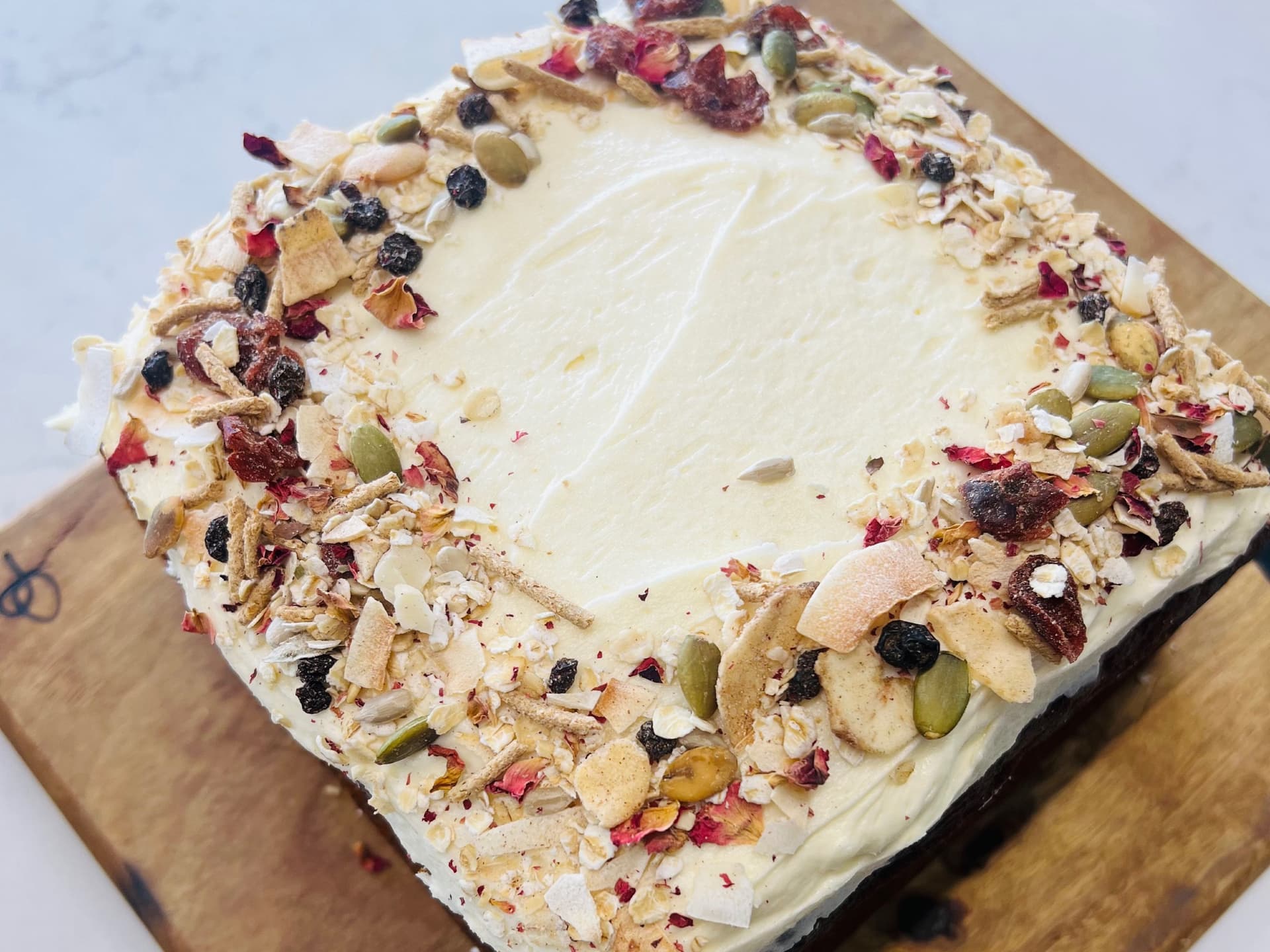 deliciously moist carrot cake topped with cream cheese icing, seeds, nuts and dried fruit
