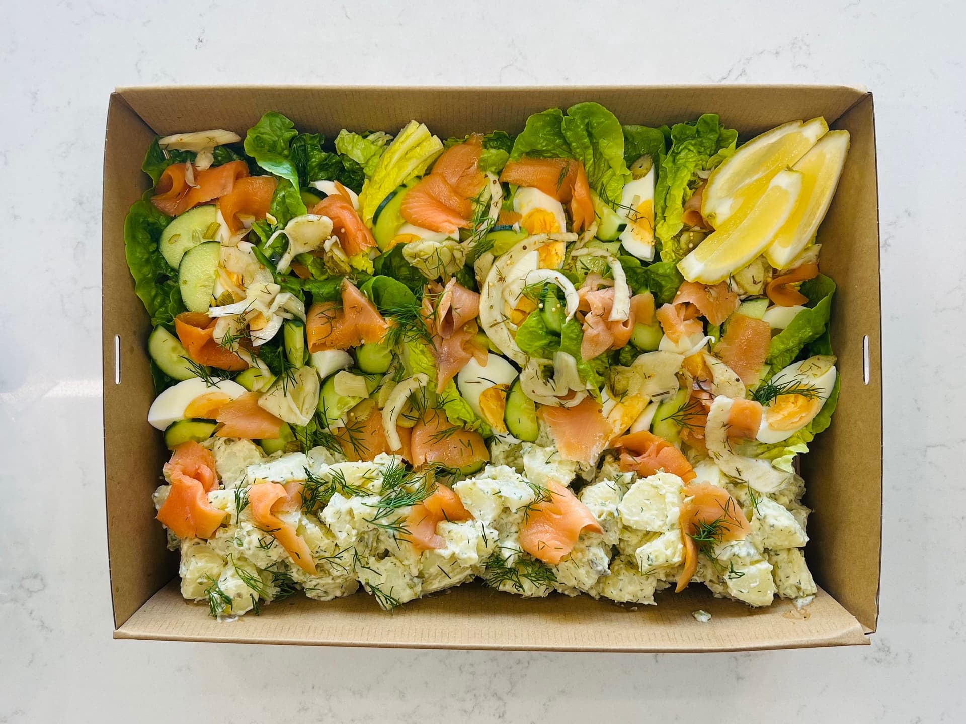 potato and caper salad smoked salmon free range eggs cos cucumber pickled fennel fresh dill-grab a baguette and have a picnic