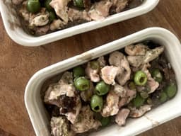 Chicken thighs, Prunes, Olives, Chicken stock, Apple cider vinegar, Capers, Extra virgin olive oil, Rapadura sugar, Garlic, Oregano, dried, Bay leaves