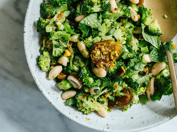 A delicious and nutricious salad which works perfectly as a side combining blanched broccoli, cannellini beans, dates and pistachio and a spiced vinaigrette. YUM