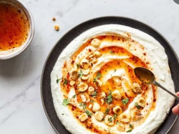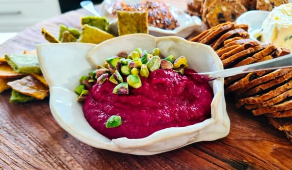 Roasted beetroot combined with garlic,, yoghurt and spices and topped with pistachios. Delicious as part of a cheese board or crackers, bread, vegetables!