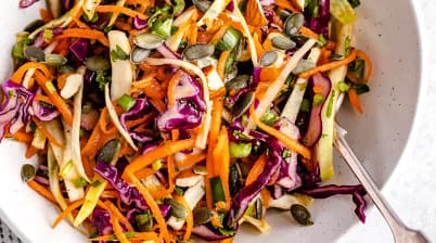 We love using lots of colour in our coleslaw to follow the mantra of eating all colours for nutrition. This salad matches perfectly with our pulled pork and lemon/yoghurt spiced lamb. We prefer a mustard, maple, lemon dressing and this is served separately.
