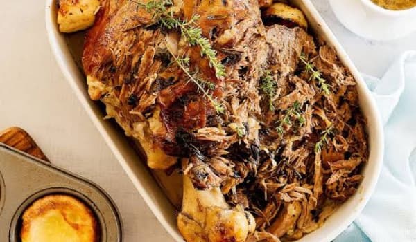 We marinate a deboned leg of lamb with garlic, oregano, olive oil, lemon and onion then slow roast.