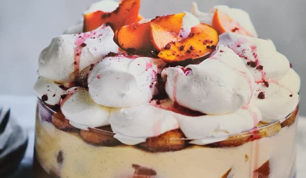 Layers of biscuits with brandy custard, fruit and topped with meringues. Sweet, fruity and utterly delicious while looking pretty! We supply the trifle in a clear acrylic bowl ready for you to serve. Recipe and image from Gourmet Traveller.