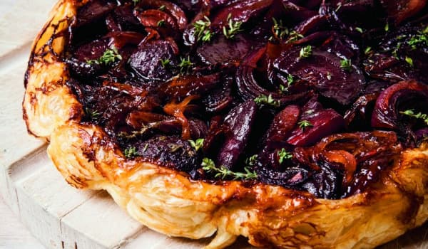 Delicious vegetarian dish. Roasted beetroot and red onion combined with a delicious sweet/sour caramel and a puff pastry base. . Serve hot or cold. Buy individual or one whole tarte tatin.