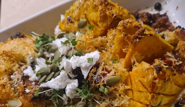 Delicious hot or cold, as a main or as a side! Simply delicious! We cook the pumpkin, stuff it with couscous, parmesan, herbs and sundried tomatoes and other goodies and roast til caramelised.