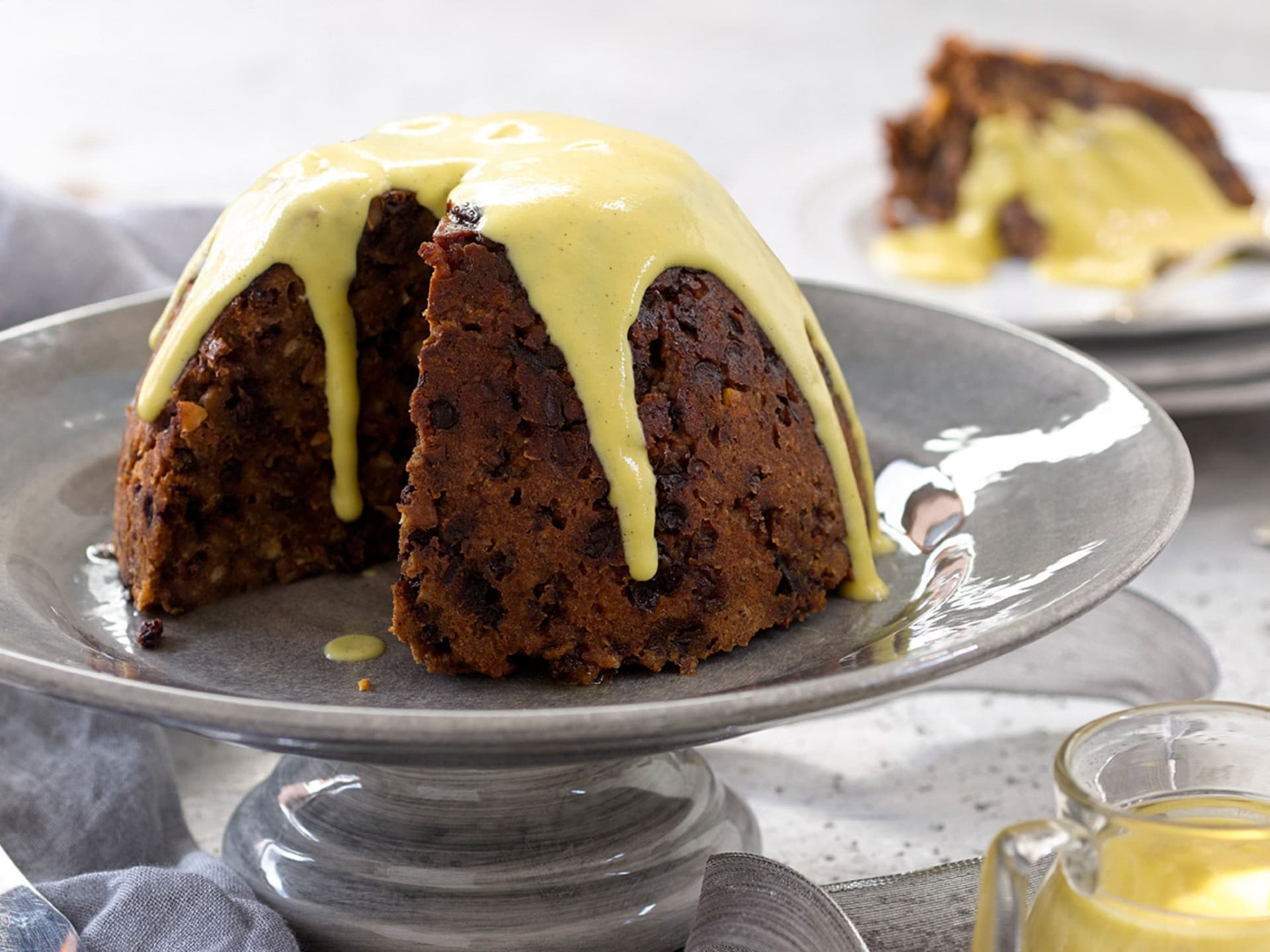 A classic Christmas plum pudding served with custard. We soak the dried fruit in rum for a couple of weeks to macerate the flavours.