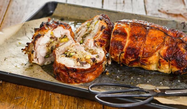 A delicious way of having chicken and it is just as nice hot or cold. We bone the chicken and roll it up with proscuitto, caramalised onion and some cranberries and bake it. Simply slice and serve. Great for leftovers too