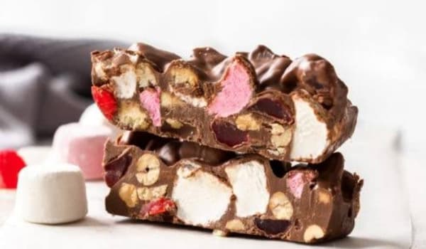 Callabaut Belgian chocolate with raspberry lollies, marshmallows and nuts and coconut and finished with dried rose petals. Everyone needs a treat!