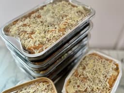 Crushed tomatoes, Beef mince, Milk, Lasagne sheets (GF), Parmesan Cheese, shredded (Milk), Brown onion, Celery Chopped 10mm Dice, Carrot Chopped 10mm Dice, Extra virgin olive oil, Nuttelex, Shallots, Plain flour (GF), Tomato paste, Black Pepper Ground, Chilli flakes, Oregano, Garlic Paste [Garlic cloves, Canola oil]
