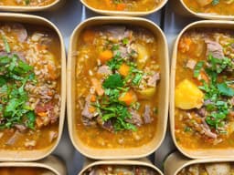 Bone Broth [Water, Chicken - Whole, Carrots, Onion, Celery, Garlic, Black pepper, Bay leaves], Potato, Carrots, Garlic, Onion, Turnip, Sweet potato, Lamb Shoulder, Brown rice, Celery, Mint, Leek