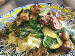 Home-made Vegetable Broth [Water, Onion, Carrots, Celery, Leek, Garlic, Black pepper, Parsley, Bay leaves], Buttery Mashed Potatoes [Dutch Cream Potato, Milk, Cream - Thickened (Milk), Butter (Milk)], Mushrooms, Garlic, Onion, White wine, Thyme, Tamari (GF) (Soy), Cream - Thickened (Milk), Baby spinach