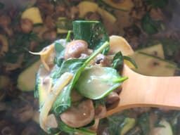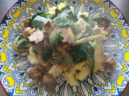 Home-made Vegetable Broth [Water, Onion, Carrots, Celery, Leek, Garlic, Black pepper, Parsley, Bay leaves], Buttery Mashed Potatoes [Dutch Cream Potato, Milk, Cream - Thickened (Milk), Butter (Milk)], Mushrooms, Garlic, Onion, Chicken breast, White wine, Leek, Thyme, Parsley, Baby spinach