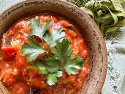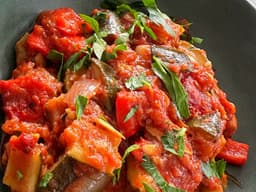 A classic French vegetable stew of eggplant, zucchini and capsicum simmered w/ tomato use as a pasta sauce serve with grilled meat or steamed vegetables.