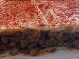 Garlic Mashed Potatoes [Potato, Soy milk, Salt, Garlic powder, White pepper], Button mushrooms, Whole Green Lentils, Vegetable stock (Home-made), Frozen peas, Onion, Carrot, Barbeque sauce GF, Tamari (Soy), Extra virgin olive oil, Garlic, Sweet paprika, Thyme, Salt, Smoked Paprika, White pepper