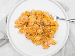 Mac and cheese with a little Asian twist. Creamy cashew sauce with a hint of gochujang - a Korean red pepper paste - is mixed with silky sweet potato, to form a delicious, moreish mac and cheese. Spiciness mild. Pantry items needed: olive oil, salt; Hands-on: 30 mins, ready in: 45 mins; Cooking equipment: medium/large deep baking dish, large pot, medium pot, small frying pan; Make this dish within 5 days of receiving your meal kit.