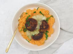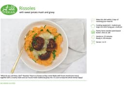 Red potato, Sweet potato, Boiling water (pantry item), Froom mince, Carrot, Brown onion, Rissole dry mix [Breadcrumbs (GF), Nutritional yeast, Garlic powder, Salt iodised, Italian herbs, Fennel seeds, Ground black pepper], Olive oil (pantry item), Plant-based butter, Gravy seasoning mix [Rice flour, Beef-style stock powder, Nutritional yeast, Dried thyme], Garlic, Parsley, Salt (pantry item)