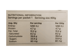 Plant based cream (Flora), Cocoa powder, Soy milk, Vegetable oil, Apple cider vinegar, Vanilla extract, Plain flour (Wheat), White sugar, Baking powder, Bicarb soda, Salt, Icing sugar, Guar gum, Xanthan gum, Cocoa butter, Beta carotene (Wheat, Soy)
