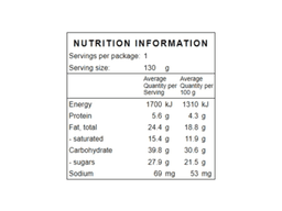 Plant based cream (Flora), Cocoa powder, Soy milk, Vegetable oil, Apple cider vinegar, Vanilla extract, Plain flour (Wheat), White sugar, Baking powder, Bicarb soda, Salt, Icing sugar, Guar gum, Xanthan gum, Cocoa butter, Beta carotene (Wheat, Soy)