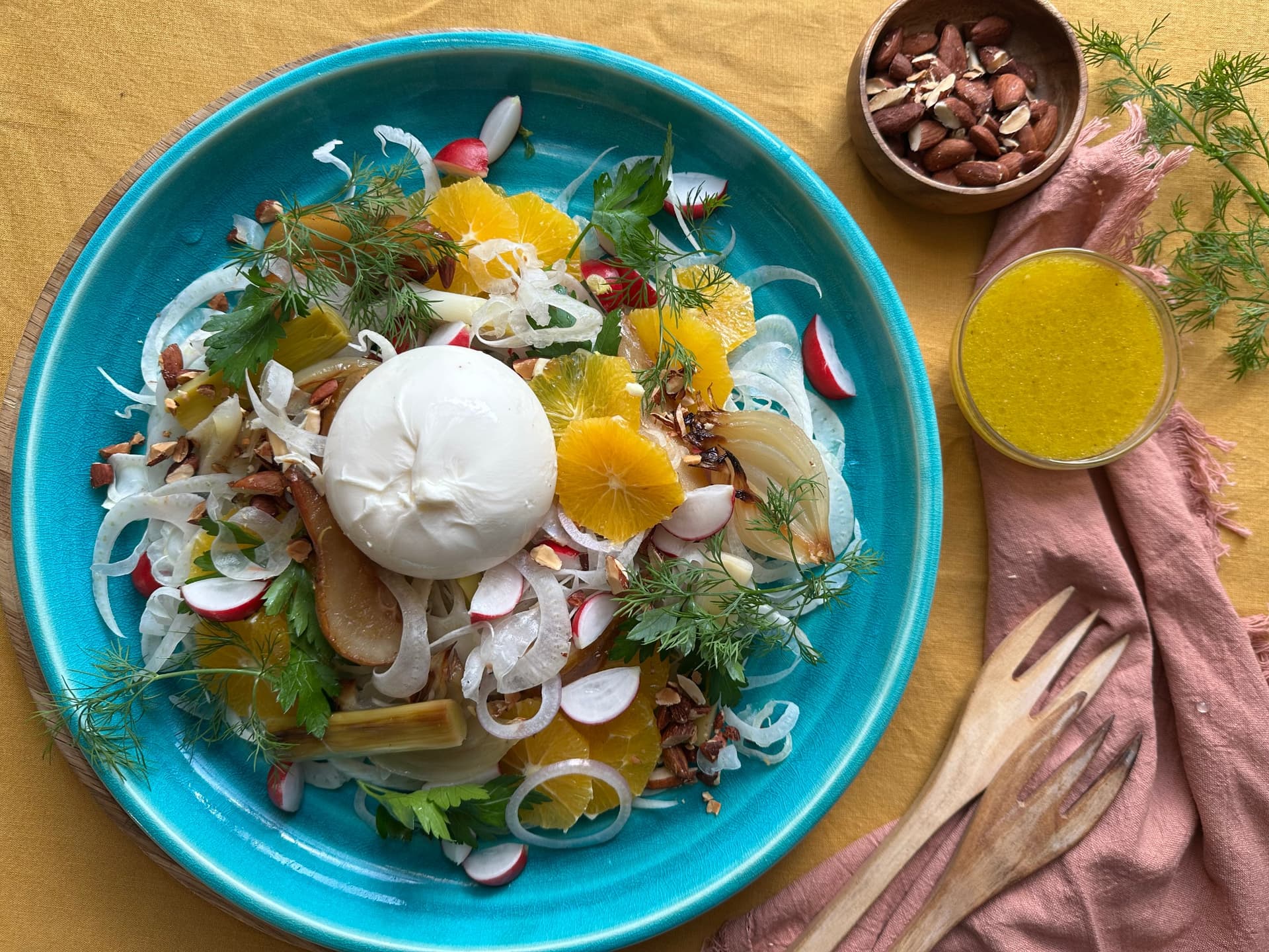 Fennel, Radish, Leek, Orange, Almonds, Honey, Red onion, Onion, Parsley, Pears, Burrata (Milk), Verjus, Dijon mustard, Black pepper