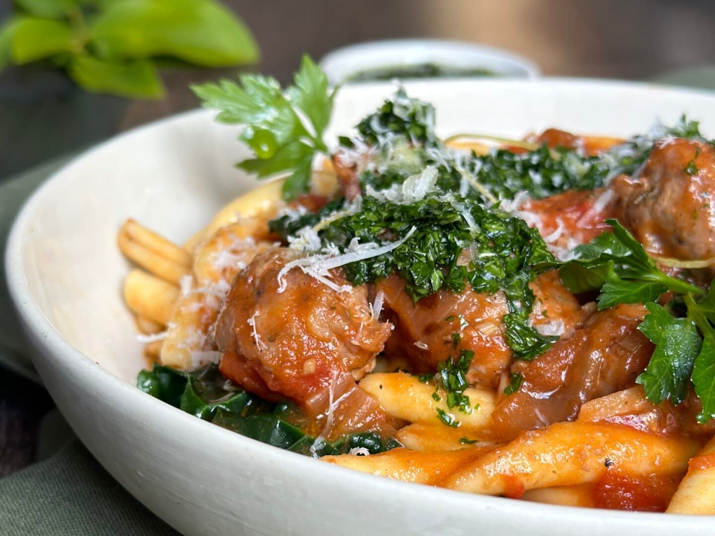Juicy pork sausages braised in a rich garlicy tomato sauce. Serve with fresh pasta