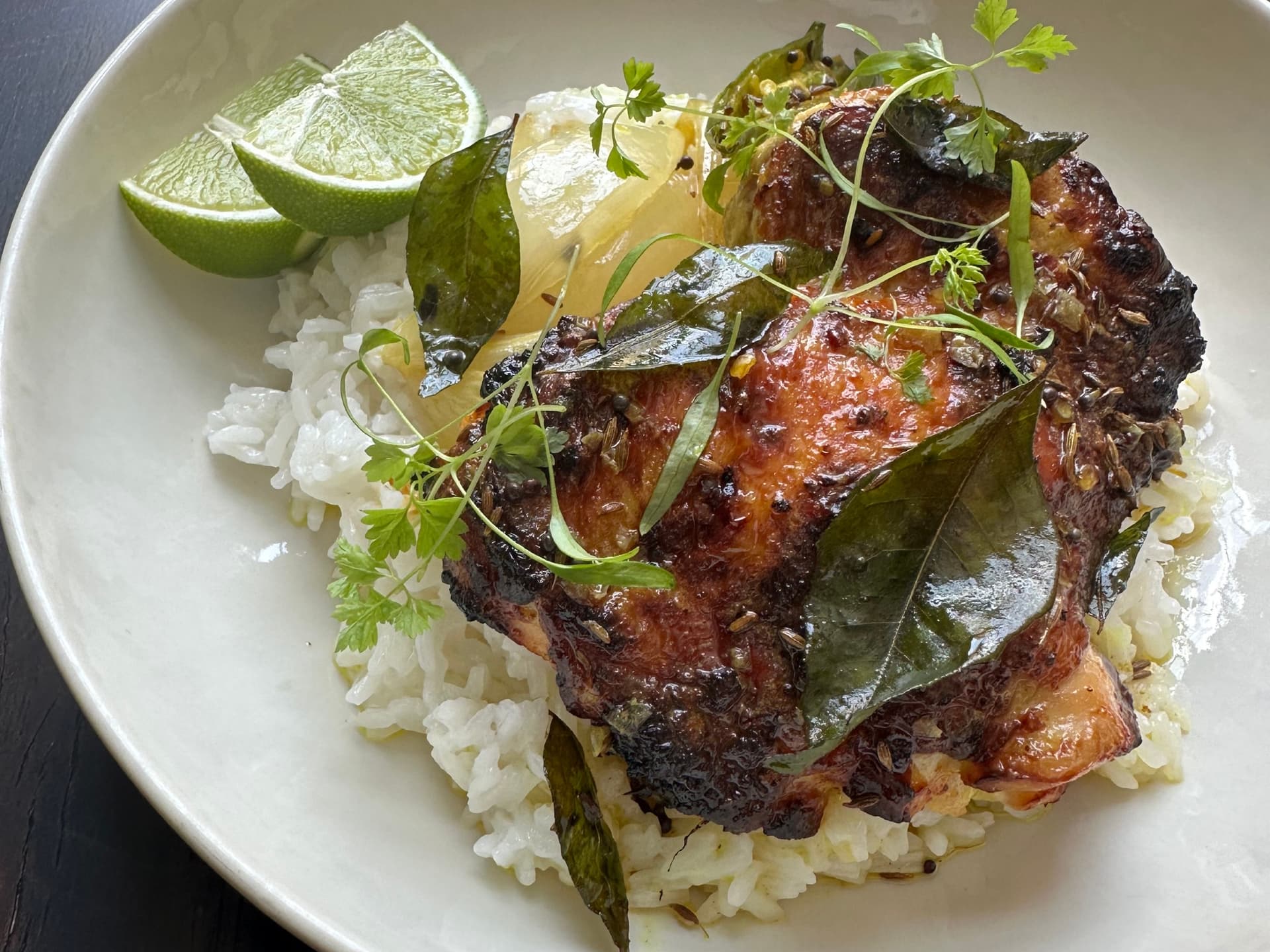 Tender chicken thighs marinated in a fragrant blend of ginger, garlic, and green chilli for a gentle warmth. Served on a bed of aromatic rice, ready to bake and fill your kitchen with enticing aromas. Finished with fresh lime and coriander for a bright, zesty twist. Simply bake, serve with coriander yoghurt. Enjoy a no-fuss, flavour-packed meal.