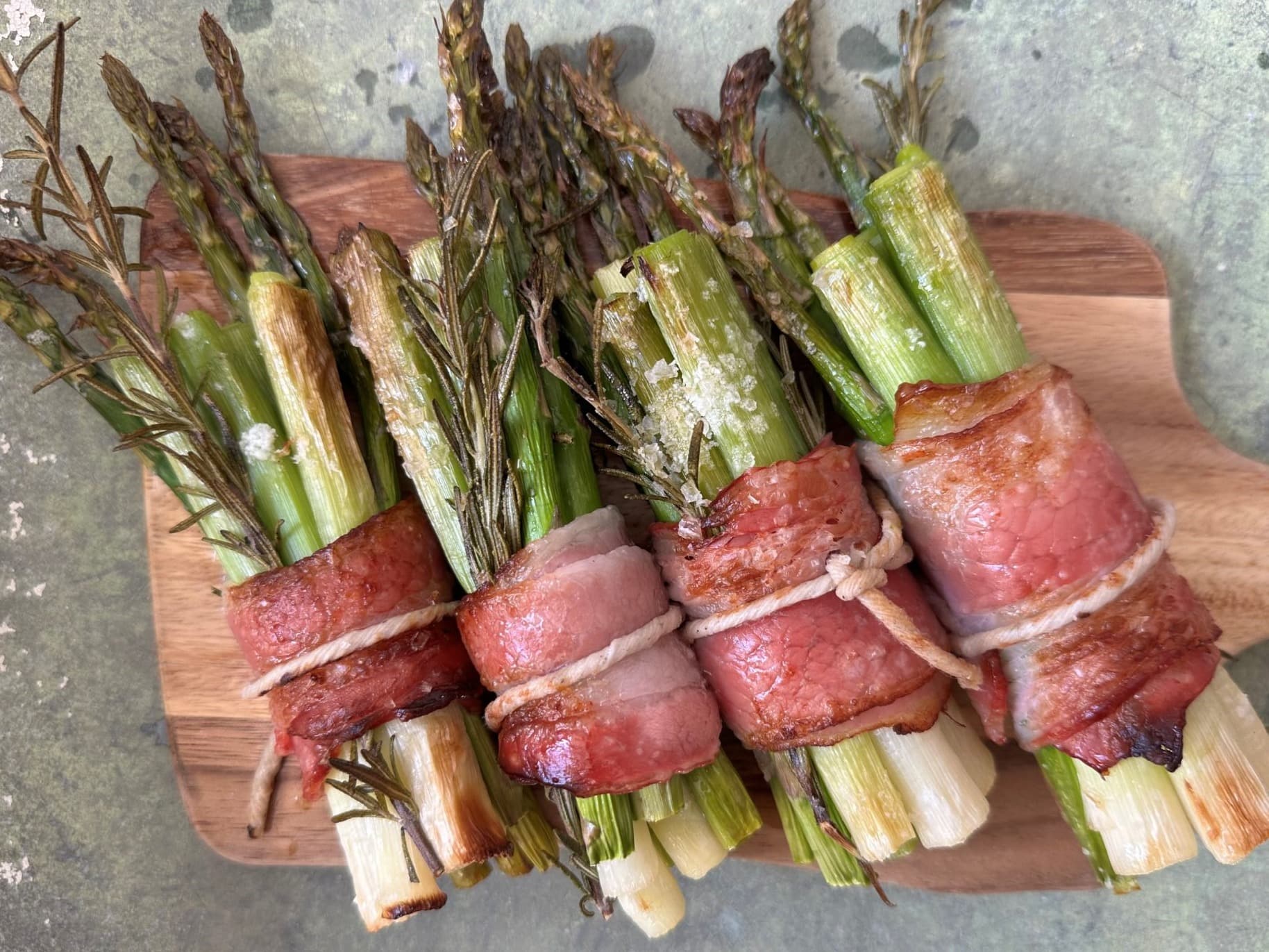 Little bundles of steamed baby leeks, seasonal asparagus and rosemary all wrapped up on bacon and ready to oven roast to perfection