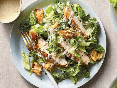 A classic salad made with buttermilk poached chicken breast, baby cos lettuce, soft boiled egg, crispy bacon, sourdough wafers and a white anchovy dressing.