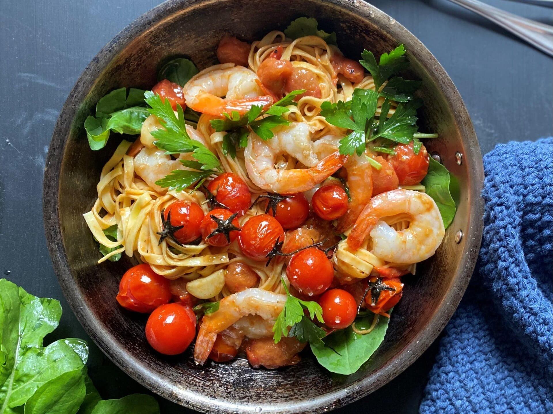 Fresh hand-made linguine, marinated prawns with a blistered cherry tomato sauce. Finished with a hit of chilli and fresh rocket. Just delicious and a fresh no-fuss dinner with a touch of 'wow"