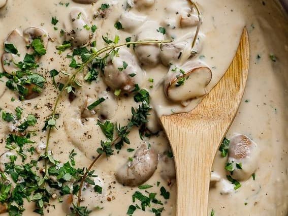 Creamy mushroom and bacon sauce ready to heat and pour over pasta.