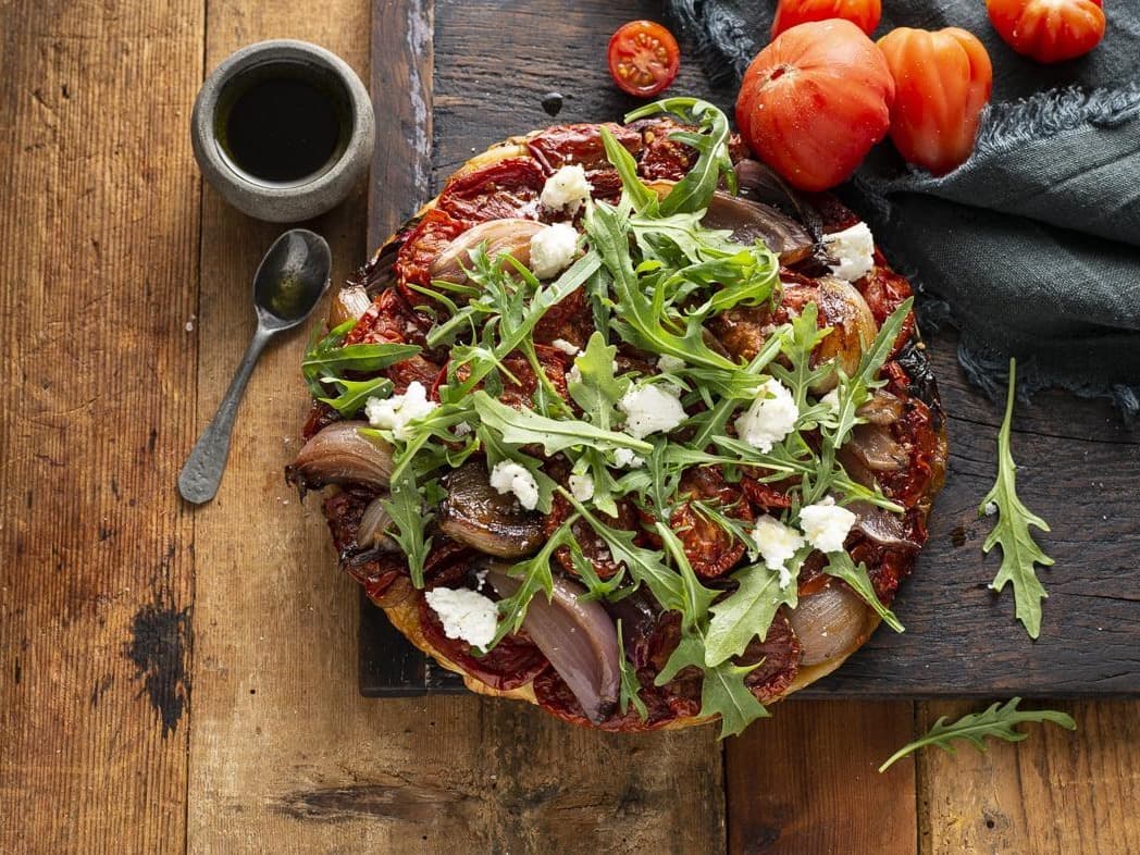 Fresh heirloom tomatoes are oven dried and placed into a shell with sauteed spinach, caramelized red onion and flaky hand-rolled puff pastry. Just pop into the oven to heat and flip onto a plate for a delightful meal. Each tart is served with a little pot of goat cheese and rocket and balsamic dressing to serve.