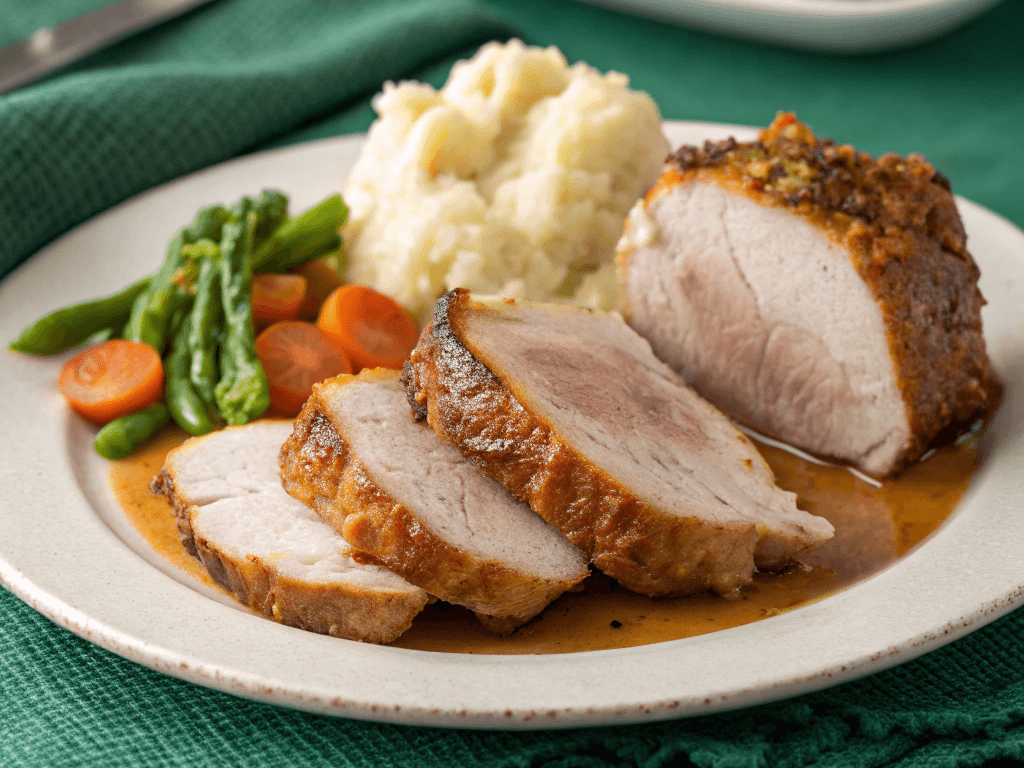 Succulent roast pork with creamy mashed potatoes and tender steamed vegetables, finished with rich gravy.