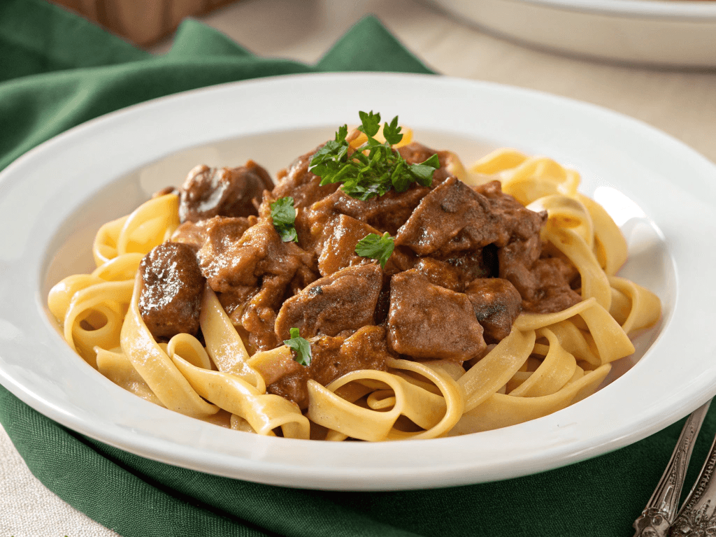 Tender beef strips bathed in a rich sour cream mushroom sauce, this Russian classic brings bold flavour, hearty comfort, and elegant indulgence to your plate.
