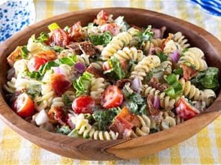 BLT Pasta Salad with Creamy Dressing A fun twist on the classic BLT, this pasta salad combines crispy bacon, juicy tomatoes, and fresh lettuce with al dente pasta for a satisfying bite. Tossed in a velvety, creamy dressing, each forkful is rich and indulgent, while still light and refreshing. The savory bacon pairs perfectly with the tangy, zesty dressing, and the tomatoes and lettuce add a burst of freshness in every bite. Whether as a side dish or a main, this BLT pasta salad is a crowd-pleaser that’s both comforting and vibrant.