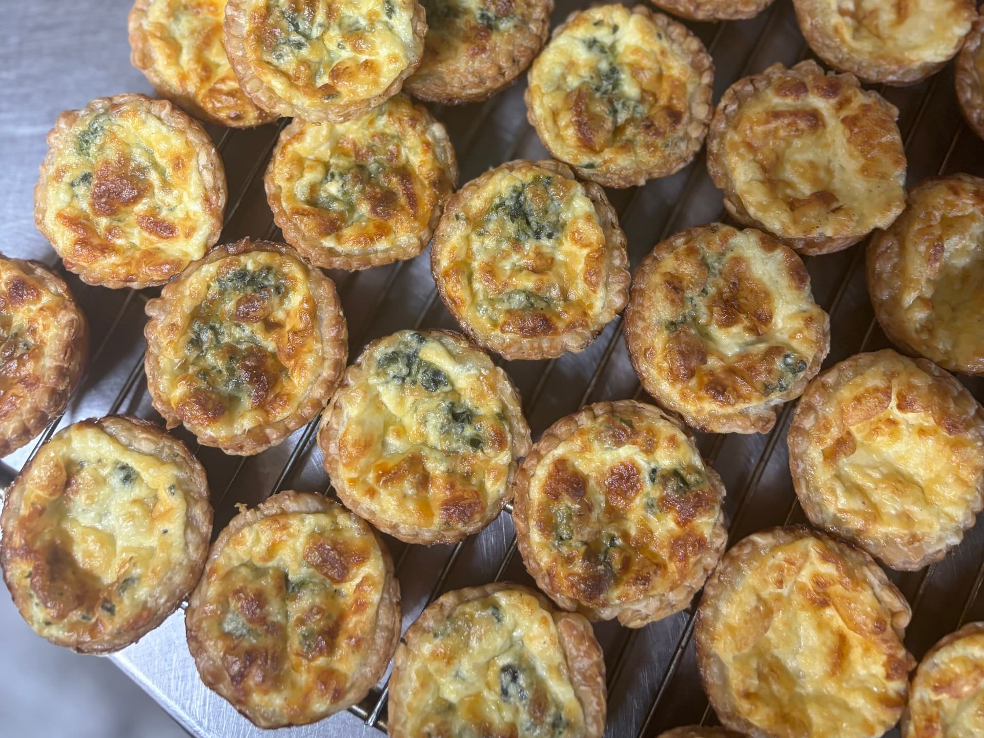 Homemade Mini Quiche (Spinach) – Flaky golden pastry filled with a creamy egg custard, fresh spinach, and a hint of cheese. Baked fresh for a light, savoury bite.