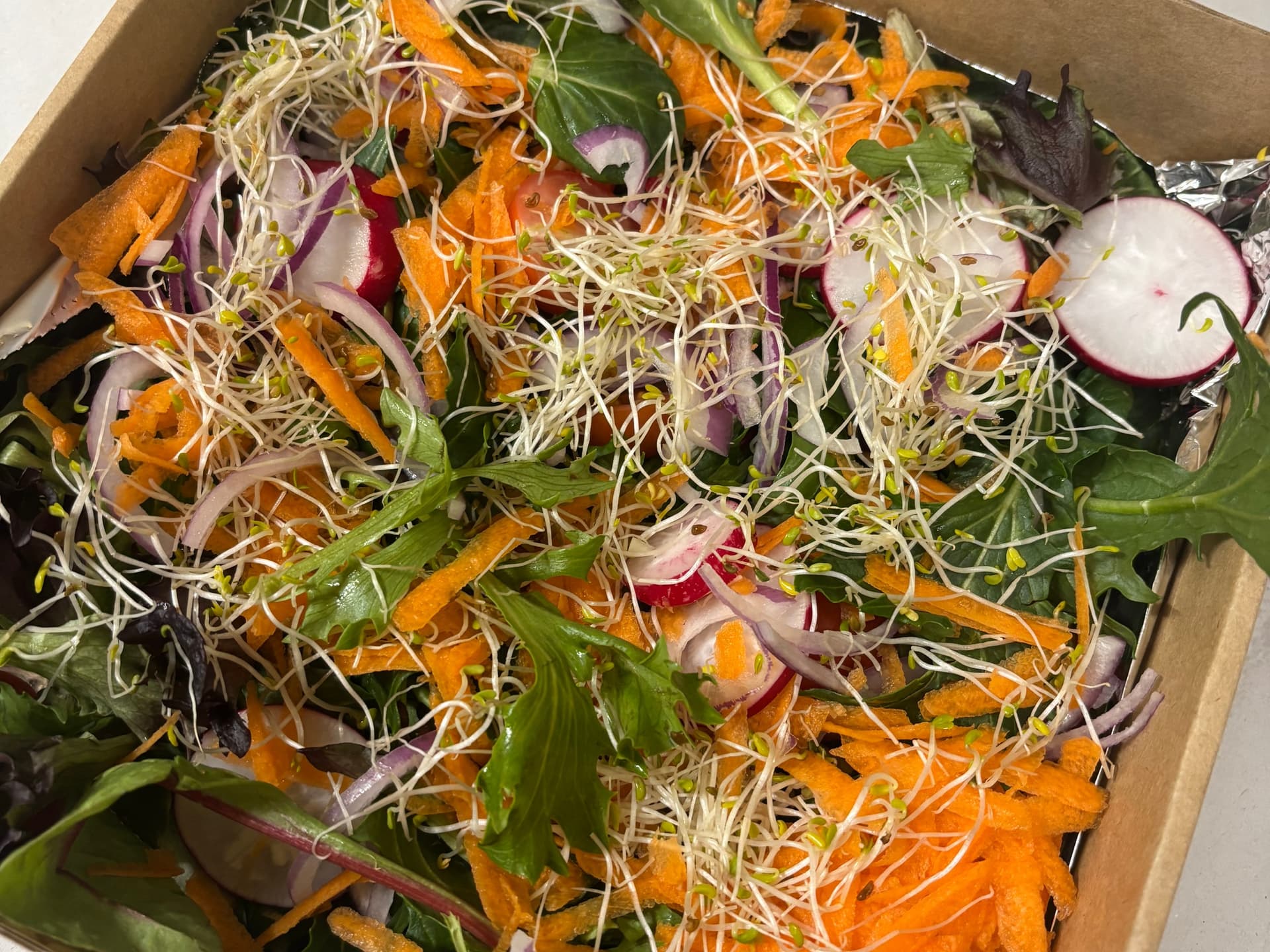 Fresh mixed greens with cucumber, tomato, and carrot, lightly tossed in a zesty vinaigrette.