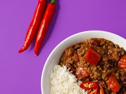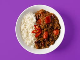 Chilli con Carne Mix [Beef mince, Tomato passata, Red kidney bean, Capsicum, Onion, Tomato paste, Taco seasoning, Salt, Garlic powder, Vegetable stock (GF), Sugar, Pepper, Bay leaves], Steamed Rice [Water, Basmati rice, Vegetable oil, Salt]