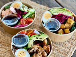 Nourish bowl is a nutritious meal composed of Flaked Baked Salmon fillet, noodles, salad, avocado, boiled egg and dressing. Serves 1-2