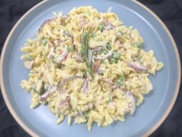 Spiral pasta (San REmo) (Wheat), Whole Egg Mayonnaise (Birch&Waite), Peas, corn & capsicums (Edgell), Bacon, Purple onion