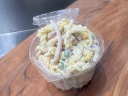 Flavoursome Pasta Salad with Crispy Bacon, Peas, Corn, Onion & Capsicum in a Egg Mayonnaise. Use as a side with any meal.