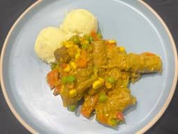 BBQ sausages (Sulphites), Mash Potato [Potatoes, Milk (Coles), Butter (Western Star) (Milk), Chicken booster (GF) Maggi], Water, Raw Carrots Chopped, Peas, corn & capsicums (Edgell), Purple onion, Chargrilled vegetable relish (Masterfoods), Crushed garlic, Chicken booster (GF) Maggi, Curry powder (Keens)