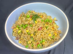 A Fried Rice with lots of flavour. Rice with peas, corn, capsicum, egg, & Smokey Bacon flavoured with our own special blended sauce.