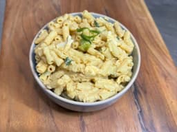 A revamped favourite macaroni pasta with a blend of three cheeses in a white sauce