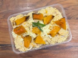 Water, Roasted pumpkin, Arborio rice (Riviana), Bacon, Brown onion, Feta (Riverina) (Milk), Butter (Western Star) (Milk), Thickened cream (Ky Valley) (Milk), Parmesan cheese (Coles) (Milk), Crushed garlic, Chicken booster (GF) Maggi, Salt, Pepper