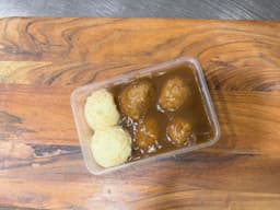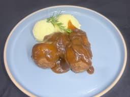 Rissoles/Tuscan Meatballs [Beef mince, Brown onion, Grated carrots, Tuscan Burger Loaf Meal (Corona) (Milk, Soy, Sulphites), Water], Gravy [Water, Gravy mix (Knorr) (Milk, Sulphites), Tomato sauce (Heinz), Worcestershire sauce (Fountain)], Mash Potato [Potatoes, Milk (Coles), Butter (Western Star) (Milk), Chicken booster (GF) Maggi]