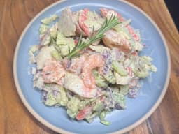 Seafood extender (Topsail) (Wheat, Crustacean, Fish, Soy), Seafood Dressing [Whole Egg Mayonnaise (Birch&Waite), Lemon juice (Coles) (Sulphites), Dill, Salt, Old bay Seasoning (McCormicks), Pepper], Prawns (Blue Wave) (Crustacean), Purple onion, Celery