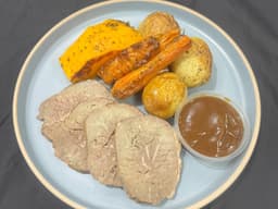Roast beef, Roasted potato, Roasted pumpkin, Roasted carrot