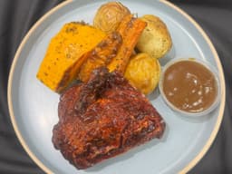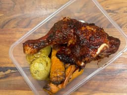 Chicken Roast Lovers!! A Quarter piece of Chicken marinated in a tasty plum flavour. Accompanied by Roast Pumpkin, Carrots & Potato with homemade Gravy to make a complete roast meal.